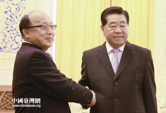 7日下午,中共中央政治局常委、全国政协主席贾庆林在人民大会堂会见来京参访的台湾台中市市长胡志强一行。(中国台湾网 陈佳慧 摄)