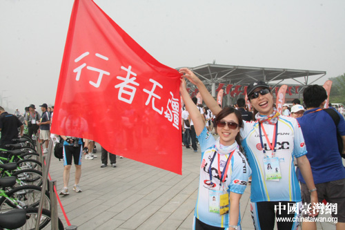 “行者无疆 绿色骑行”,两名台湾青年在活动中留影纪念。(中国台湾网 于斯文 摄)