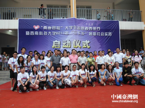 中国台湾网7月12日绵阳消息 日前,由绵阳市台办、共青团西南科技大学团委、清华大学港澳台事务办公室、西南科技大学港澳台事务办公室、游仙区刘家镇党委政府共同主办的第五届“两岸同心”大学生志愿者西部行暨西南科技大学2011年“三下乡”暑期社会实践活动在四川绵阳刘家镇小学正式拉开帷幕。来自台湾新竹清华大学、台湾师范大学、台湾大学、成功大学以及清华大学(北京)、中国美院和绵阳西南科技大学等40余名师生参加启动仪式。