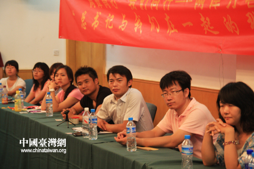 中国台湾网7月13日北京消息 今天下午,作为两岸万名青年大型交流活动之一的两岸青年学生“追寻历史的足迹”参访团在北京大学进行参观交流活动,并举行“总书记与我们在一起的那一刻”主题座谈会,展开热烈讨论。胡锦涛总书记的和蔼可亲、平易近人,给两岸青年学子们留下了深刻印象。