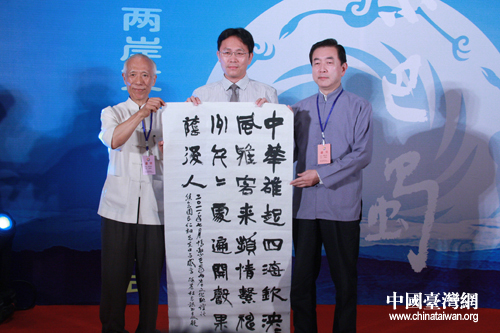 台湾嘉宾团团长焦仁和将题有“中华雄起四海钦,泱泱风雅客来频。情系神州千千处,遍开馨果荫后人”诗句的书法作品,赠与中华文化联谊会副秘书长肖夏勇。(中国台湾网 赵辉 摄)