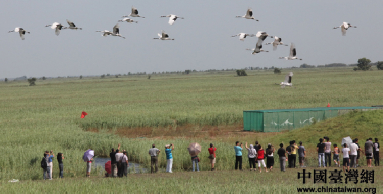 海外台商一行走进扎龙国家自然保护区,观赏美禽丹顶鹤。(中国台湾网 芮益芳 摄)