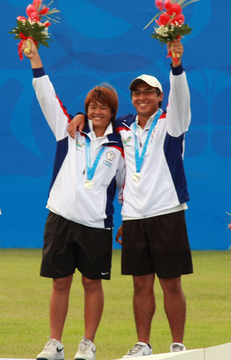 夺得大运会反曲弓混合团体赛银牌的中华台北选手袁叔琪(左)、田刚(右)。(中国台湾网 于斯文 摄)