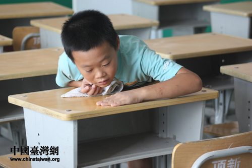 仔细擦去课桌上的灰尘,迎接新学期的到来。(中国台湾网 王怡然 摄)