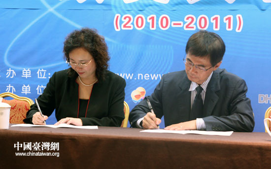 中国台湾网总经理总编辑刘晓辉(左)与台湾亚洲大学副校长邓成连教授(右)签订2012海峡两岸大学生网络商务创新应用大赛合作意向书。(中国台湾网 李丹 摄)