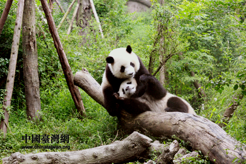 两只活泼的幼年熊猫在亲密嬉戏。(中国台湾网 马迪 摄)