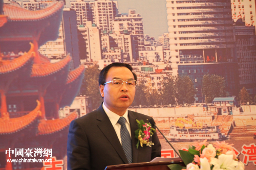 2011鄂台产业合作与发展论坛7日上午在武昌洪山宾馆举行,武汉市长唐良智发表演讲。(中国台湾网 杨丽 摄)