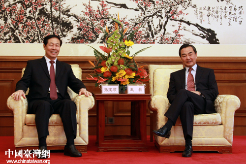 签字仪式开始前,国台办主任王毅与安徽省委书记张宝顺举行了会谈。(中国台湾网 杨丽 摄)