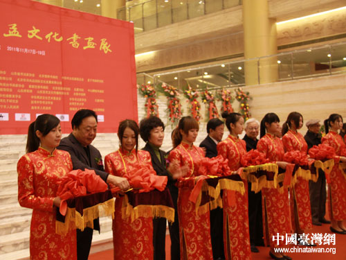 中国台湾网11月18日济南消息  海峡两岸孔孟文化书画展11月17日上午在山东博物馆开幕。山东省政协副主席、党组副书记乔延春,省政协副主席栗甲,省台办副巡视员庄卫平,台湾中华书院院长李奇茂,著名书画大师孙大石等出席开幕式。