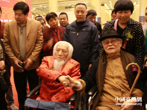 台湾中华书院院长李奇茂(右)、著名书画大师孙大石(左)出席开幕式。(图片来源:山东省台办)