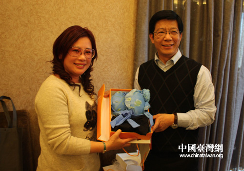 葫芦岛市副市长石文光与台湾中国海峡旅行社董事长兼总经理许淑玲女士互赠礼品。(图片来源:葫芦岛市台办)