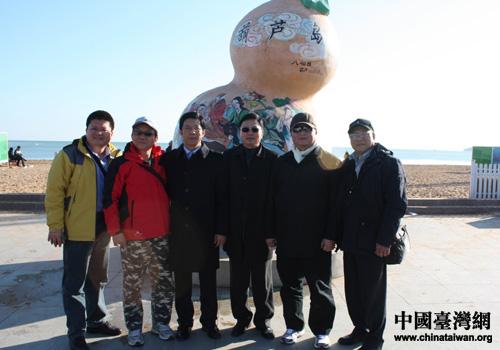 葫芦岛市副市长石文光陪同考察团成员参观龙湾海滨,并合影留念。(图片来源:葫芦岛市台办)