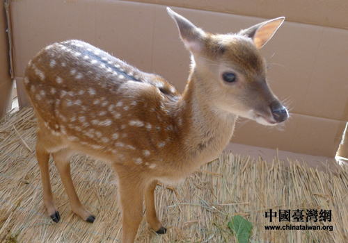 中国台湾网11月29日威海消息 日前,台湾赠送大陆的梅花鹿“点点”的“千金”满月,山东威海刘公岛国家森林公园为鹿宝宝举行了满月庆典。专程赶来的“娘家人”台北市立动物园兽医师李安兴现场展示了送给鹿宝宝的满月贺礼。