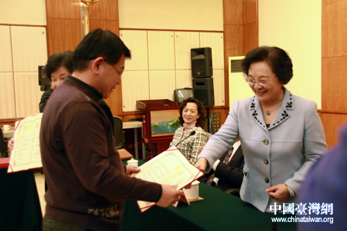 全国政协副主席、台盟中央主席林文漪向台盟受到表彰的先进集体和个人颁发荣誉证书。(中国台湾网 王怡然 摄)