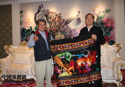广西壮族自治区主席马飚(右)向台湾花莲农民代表团赠送广西壮族特色工艺品壮锦。(图片来源:广西台办)