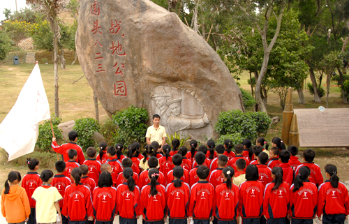 围头村主任洪水平在八·二三公园给学生讲历史。(夏庚元 摄)