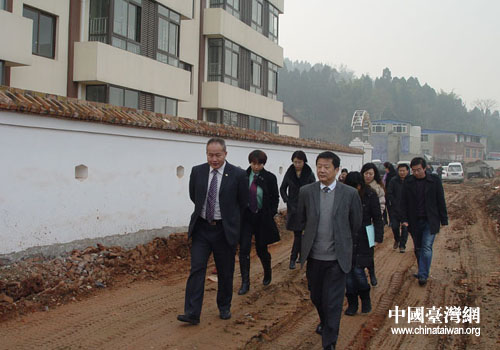 德阳市台办主任独远程(前右1)陪同林郁华协理(前左1)等来宾参观即将竣工的新福利院。(德阳市台办 甘和林 摄)