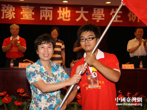 2011年7月15日,河南省台办主任宋丽萍为豫台两地大学生研习营授旗。(图片来源:河南省台办)