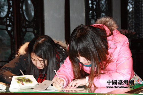中国台湾网2月4日苏州消息 由宋庆龄基金会主办的“追寻历史足迹”——城际高铁之旅活动开始了第三天的行程。今天,来自两岸的青年学子参观了杭州灵隐寺飞来峰及中国四大名园之一,苏州著名的园林拙政园。每到一处,台湾的同学都会购买当地特色的明信片,盖上当地著名景点的邮戳。写满同学们内心感受的明星片将被寄给他们的父母亲朋及大陆的好朋友。真可谓是“小小明信片 邮寄两岸情”。