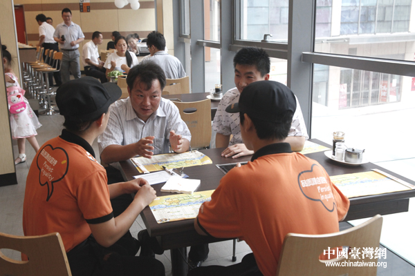 贺光启(中)与店员沟通服务方法(中国台湾网 李徽 摄)