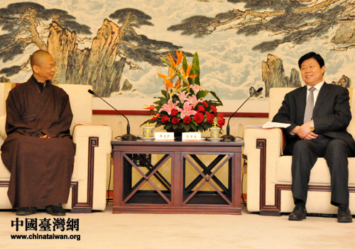 山东省副省长贾万志在济南会见台湾中台禅寺男众部副住持、专任研经院院长释见护。(图片来源:山东省台办)