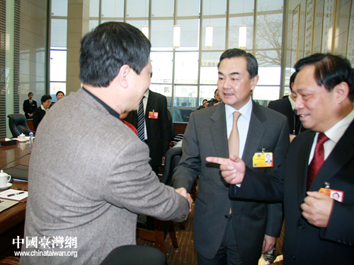 中共中央台办、国务院台办主任王毅出席十一届全国人大五次会议台湾代表团全体会议。图为王毅同台籍人大代表亲切握手。(中国台湾网 王伟 摄)