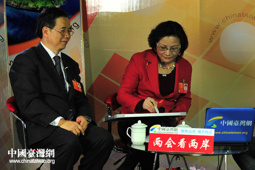 3月9日,十一届全国人大台湾团副团长陈蔚文(左)和代表陈云英接受本网视频专访。(中国台湾网 田云鹏 摄)