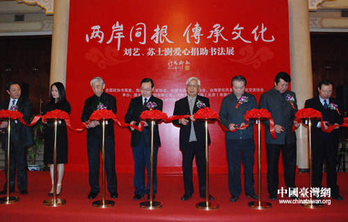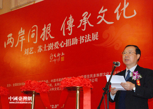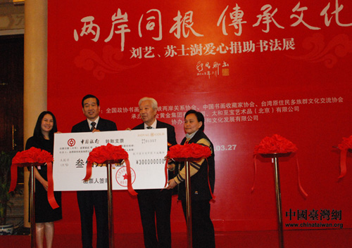 中国台湾网3月28日北京消息 由全国政协书画室、中国书画收藏家协会主办的“两岸同根,传承文化——刘艺、苏士澍爱心捐助书法展”昨日上午在全国政协礼堂隆重举行。活动共展出刘艺、苏士澍两位当代著名书法家作品80余幅。同时,两位名家还当场向台湾省花莲县秀林乡捐赠人民币300万元筹建“爱心图书馆”。原全国政协副主席、政协书画室主任张思卿,海峡两岸关系协会副会长王在希,台湾地区少数民族民意代表高金素梅等出席活动。