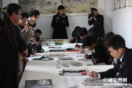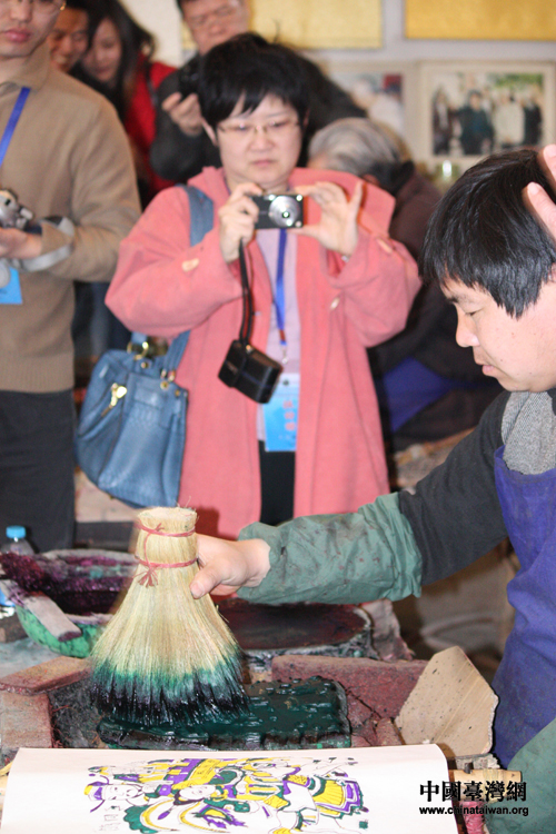 两岸三地记者联合采访团3月25日上午参访河南开封朱仙镇木版年画(中国台湾网记者 王文英 摄)