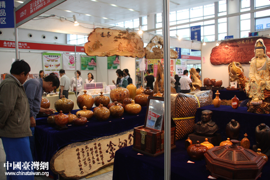 台湾阿里山侩木工艺品引发观展者兴趣。(中国台湾网 王思羽 摄)