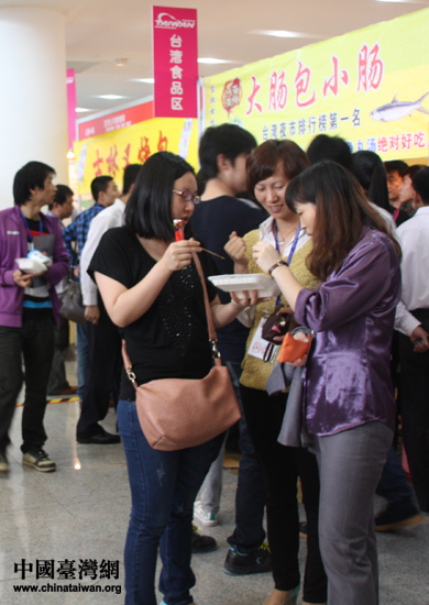 逛展市民开心分享台湾小吃。(中国台湾网 王思羽 摄)
