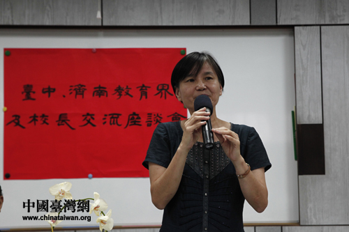 雾峰小学校长许慰敏向参访团介绍学校概况(中国台湾网 邢同林 摄)