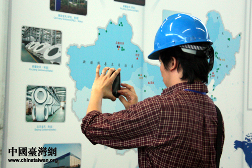 在酒泉新能源装备制造产业园区,台湾中国电视公司记者何劲松用手机拍摄新疆金风科技股份有限公司发展情况概览图。(中国台湾网 郜利敏 摄)