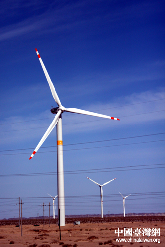 中国台湾网6月1日敦煌消息 一座座风电机组鳞次栉比地矗立在广袤戈壁上,宛如壮阔的“白色森林”。5月31日,海峡两岸媒体“陆上三峡行”采访团记者前往酒泉市瓜州县参观风电场和风电机组的运行情况。