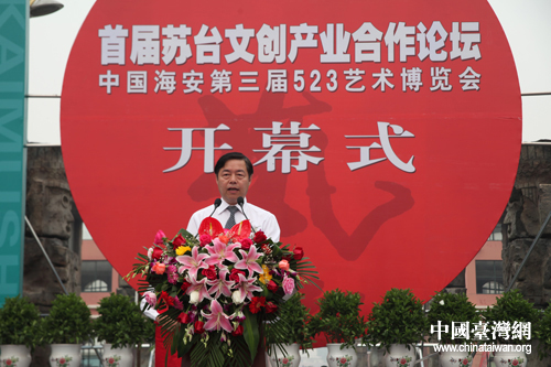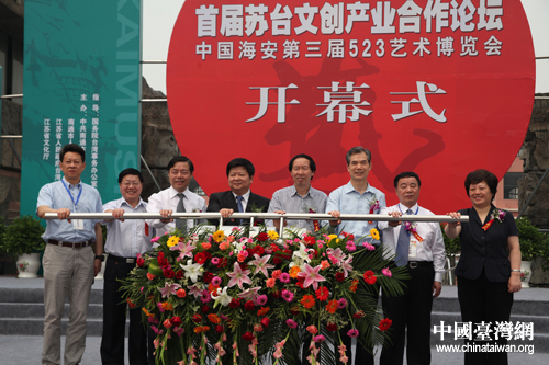 中国台湾网6月6日南通消息 首届苏台文创产业合作论坛暨中国海安第三届523艺术博览会6日上午在江苏省海安县隆重开幕,来自海峡两岸及海内外的近千位嘉宾欢聚一堂,共同探讨加强苏台文化交流,促进两岸文创产业合作。国台办主任助理龙明彪、信息中心主任仇开明,文化部文化产业司司长刘玉珠,江苏省台办副主任石细云,南通市委书记丁大卫等出席开幕式。