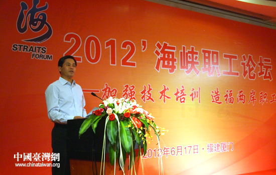 17日,第四届海峡论坛·海峡职工论坛在厦门举行。图为中华全国总工会副主席、中国职工交流中心会长陈豪致辞。(中国台湾网 张瑞宸 摄)