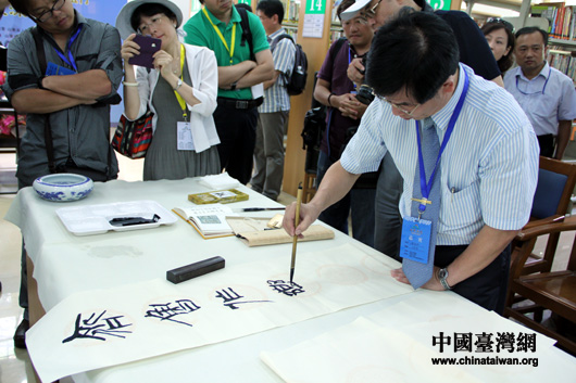 台湾著名书法家陈志声用篆书写下对联。(中国台湾网 芮益芳 摄)