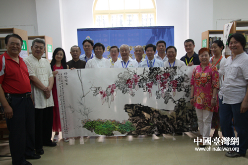 “情系齐鲁——两岸文化联谊行”之两岸文化交流笔会7月2日在济南大明湖畔举行。图为两岸画家合作的大幅画作。(中国台湾网 芜同 摄)
