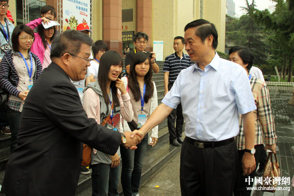 应中共四川省委书记刘奇葆邀请,台湾云林县、南投县和彰化县的105名师生,由台湾民意代表马文君、王惠美带队,赴四川参加第三届“台湾学生天府夏令营”活动。图为刘奇葆与台湾师生亲切握手。(中国台湾网 王伟 摄)