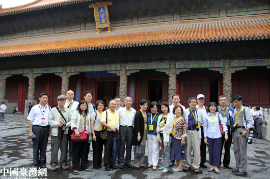“情系齐鲁——两岸文化联谊行”参访团嘉宾在孔庙内的大成殿合影。(中国台湾网 芮益芳 摄)