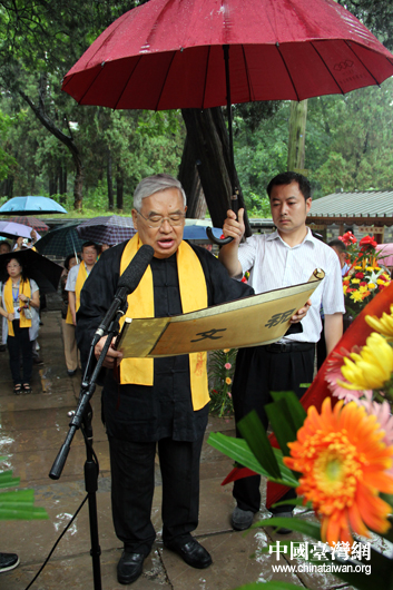 “情系齐鲁——两岸文化联谊行”台湾嘉宾团顾问、台湾世新大学讲座教授曾永义现场恭读祭文。(中国台湾网 芮益芳 摄)