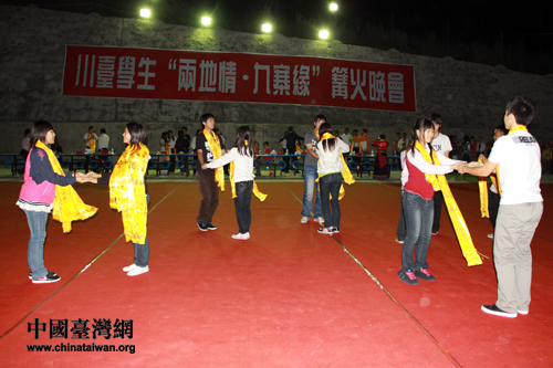 夜空下的九寨沟略显寒意,沟漳扎小学的篝火旁却暖意融融,倍感温馨。在场的所有人跳起欢乐的锅庄,享受着民族独特的魅力。相信在未来的岁月中,在场的两岸青年学子都会铭记住这个欢乐而难忘的夜晚。(中国台湾网记者 王伟)