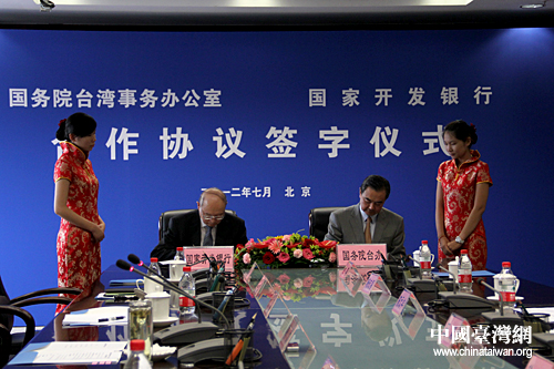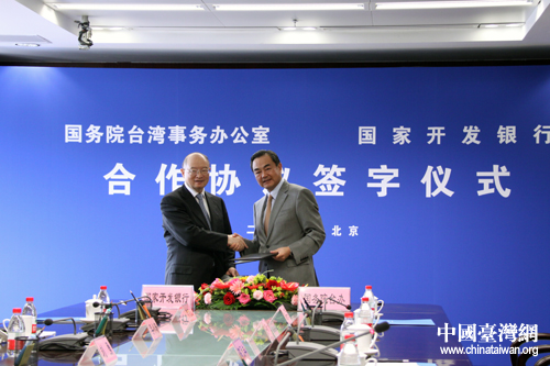 中国台湾网7月18日北京消息 国务院台湾事务办公室与国家开发银行18日在北京举行《促进两岸经济繁荣与企业共同发展合作协议》签字仪式,双方将在支持大陆台资企业发展和陆资赴台等领域通力合作,促进两岸经济共同发展。国台办主任王毅、国开行董事长陈元出席仪式并代表双方签字。