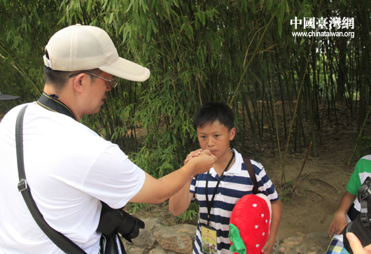 在熊猫馆外的竹林旁,带队老师,也是台湾少数民族泰雅人的林秋霖摘下一片新长出来的嫩竹叶尖,放进全彦玮小朋友嘴里。老师说,这种叶片富含水分,台少数民族的祖先过去在野外找不到水源时,就吸取叶子前端微甜部分来获取水分。