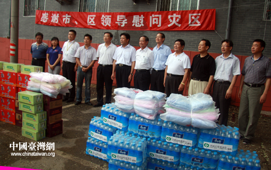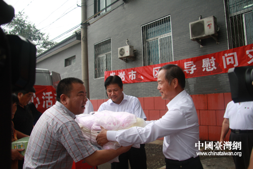 25日下午,北京市台办和北京台资企业协会负责人来到深受水灾困扰的重灾区房山区河北镇,向暴雨受灾群众捐赠了1000条毛巾被、1000箱矿泉水和1000箱方便面等一批急救物资。(中国台湾网 高斯斯 摄 )