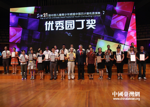 中共中央政治局原委员、十届全国人大常委会副委员长李铁映为获奖教师颁奖并合影。(中国台湾网 王怡然 摄)