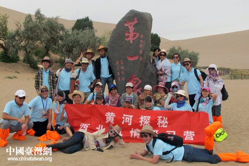 “黄河探秘—西北风情研习营”全体营员在月牙泉边合影留念。(中国台湾网 张洁 摄)