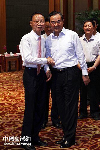 中共中央台办、国务院台办主任王毅18日下午在成都会见了前来参加第三届两岸县市“双百论坛”的台湾县市民意代表,图为王毅(右)与新北市议长陈幸进(左)亲切握手。(中国台湾网 杨丽 摄)