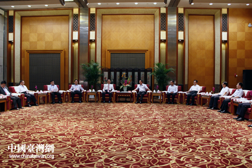中共四川省委书记刘奇葆,中共中央台办、国务院台办主任王毅,中共四川省委副书记、省长蒋巨峰等,18日下午在成都会见了前来参加第三届两岸县市“双百论坛”的台湾县市民意代表。(中国台湾网 杨丽 摄)