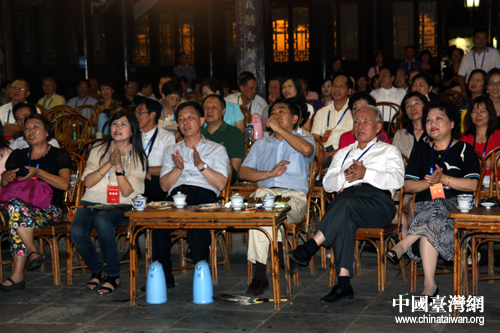 19日傍晚,前来成都出席第三届两岸县市“双百论坛”的100余位台湾议员和大陆有关省市的部分地市人大、政协代表在成都著名旅游景区武侯祠结义楼举办了一场别开生面的纳凉联欢晚会。中共中央台办副主任叶克冬参加晚会。(中国台湾网 王怡然 摄)